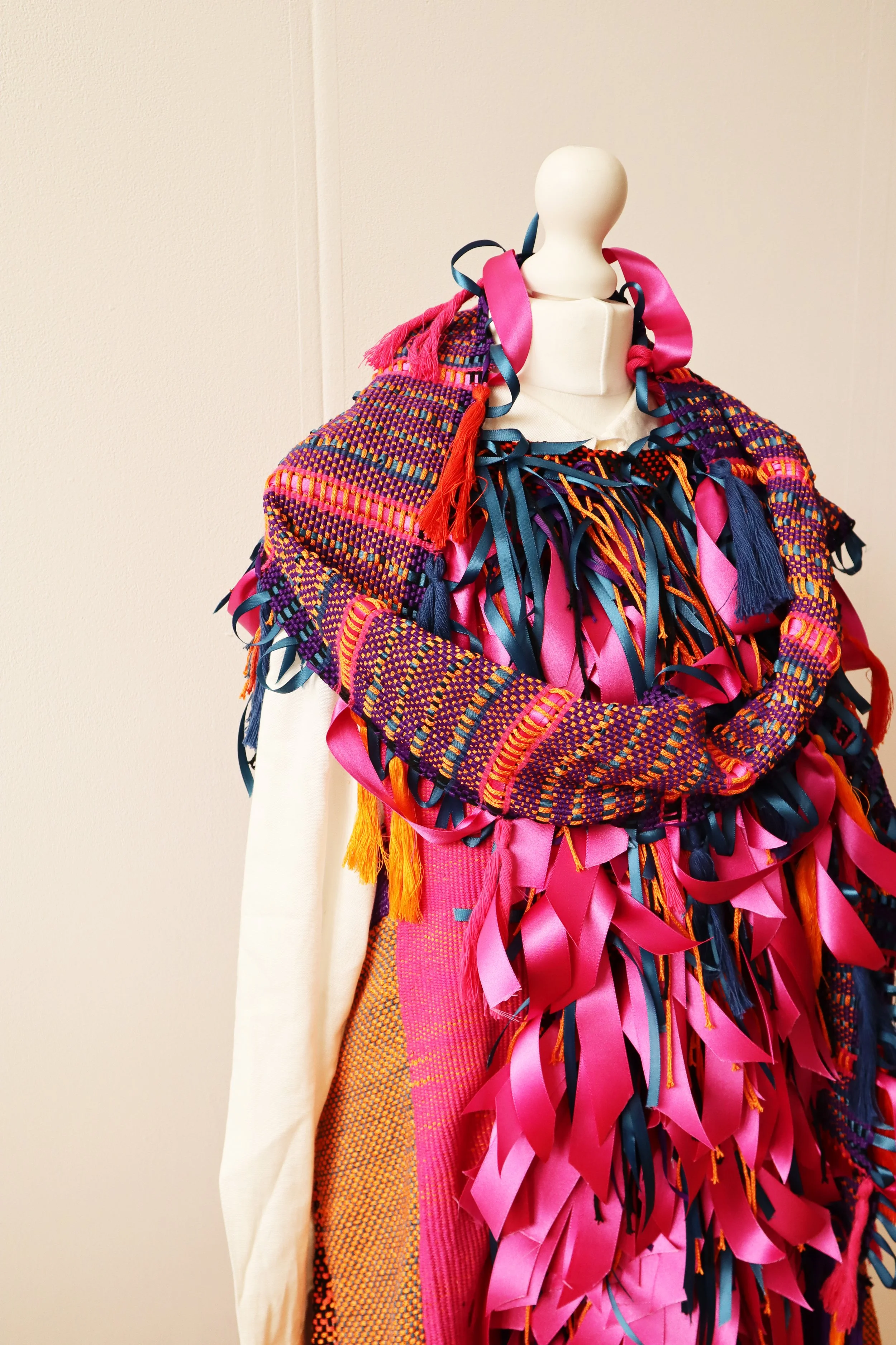 Jenny’s work, ‘Walking Archive of a Future Textile Historian (2065)’, for the Metamorphosis of Workwear project pays tribute to women in the textile industry past and present in the form of a handwoven ‘archive apron’. The archivist or historian could point to different weaving techniques and products woven in Manchester, including plain, tabby and inlay weaves, as well as passementerie trimmings.