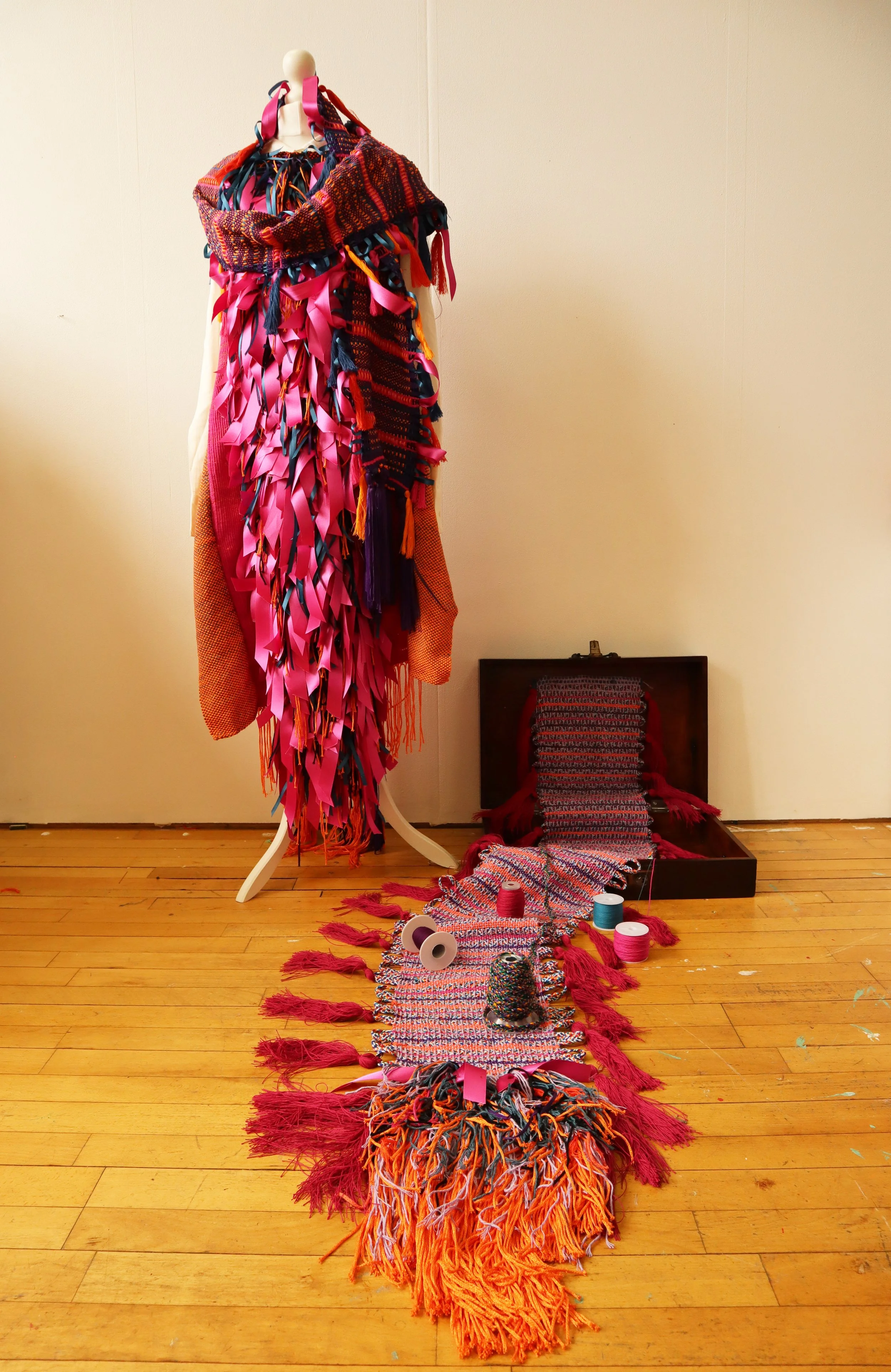 The colour way of pink, blue, orange and purple came from a geometric design in the Museum of Science and Industry archive by Manchester based 1930’s female designer Jean Elizabeth Gregson, whose work Jenny also referenced in one of the patterns in the Textile City installation. The wooden antique box refers to the portfolio cases the historic textile designs are held in within the MOSI archive, which Jenny has explored within her research for various projects.